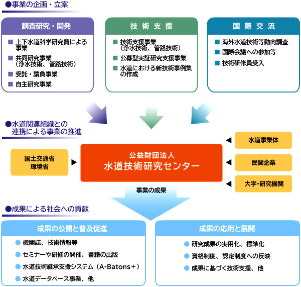水道技術研究センターでは、企画・立案した様々な事業を、国土交通省・環境省や水道事業体、大学、研究機関、企業などと連携して進めています。研究委員会などの組織作りも行い、主体的に取り組んでいます。
